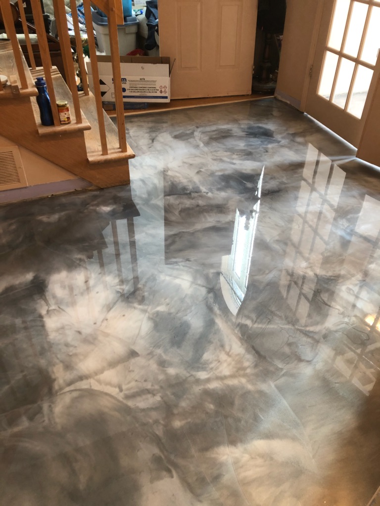 Le revêtement de sol en époxy métallique est un système de qualité industrielle à trois couches qui consiste en une couche d'apprêt époxy de couleur solide, une couche d'époxy métallique et une couche de finition en uréthane au fini brillant, satiné ou mat.